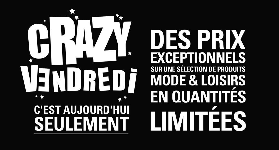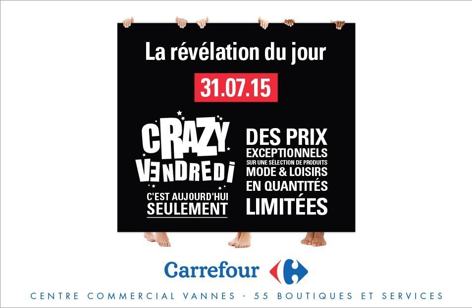 C’est une première pour Carrefour – Vannes. L’enseigne organise un « Crazy Vendredi » à l’image d’une grande braderie sur un seul jour. Le 31 juillet 2015, il sera possible de s’habiller et s’équiper à prix très réduits sur une sélection de produits Mode et Loisirs à Carrefour – Vannes et dans les boutiques du centre commercial. Le tout accompagné d’une campagne de communication print (journaux) et web (sur le site de la marque), d’une campagne de mailing et un spot radio quotidien sur une semaine.