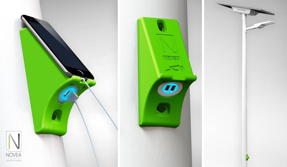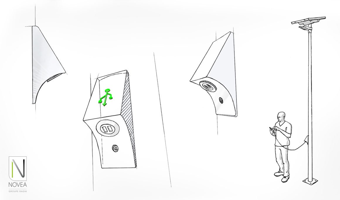 Le module de charge USB de conception Novéa Énergies, est une solution permettant la charge de périphériques USB tels que des téléphones mobiles. Ce module est une pièce mécanique en fonderie d’aluminium avec 2 prises USB qui se fixe sur le mât des luminaires solaires. Une fois la batterie pleinement chargée, l’énergie produite en excédent par les panneaux solaires alimente le module USB. Un rétroéclairage bleu indique la disponibilité du service.